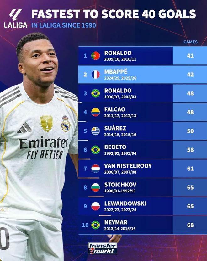根据德转的统计,姆巴佩42场打进40球的数据是西甲自1990年以来达成联赛40球大关的第二快纪录,仅次于C罗的41场40球,领先于大罗的48场40球。